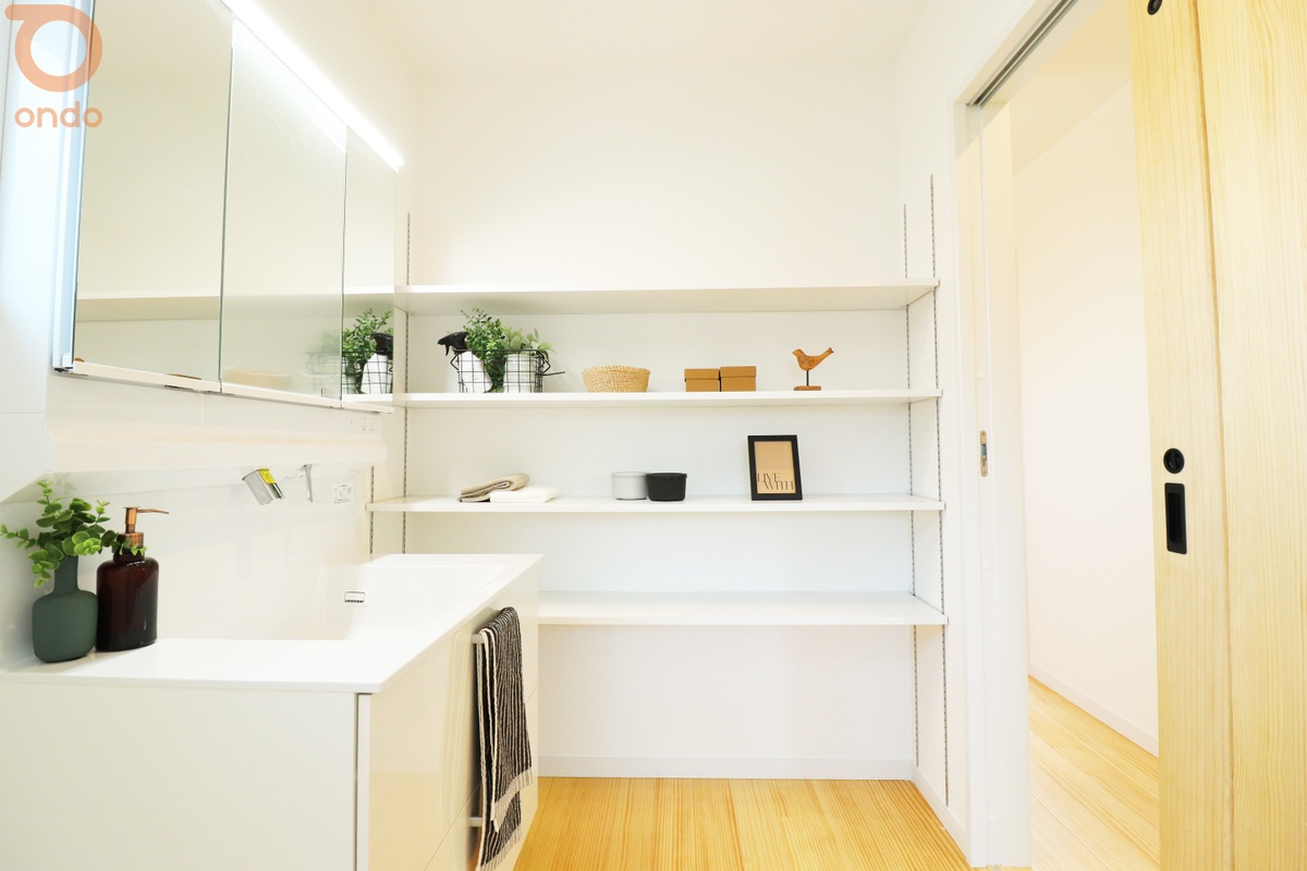 ■清潔感のある三面鏡付き洗面台は、収納力もたっぷり。