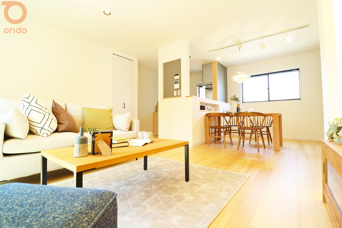 ■ソファでのんびりくつろぎながら、ダイニングやキッチンともつながれるリビング。料理や片付けをしながらでも会話が弾む、家族にうれしい空間です。