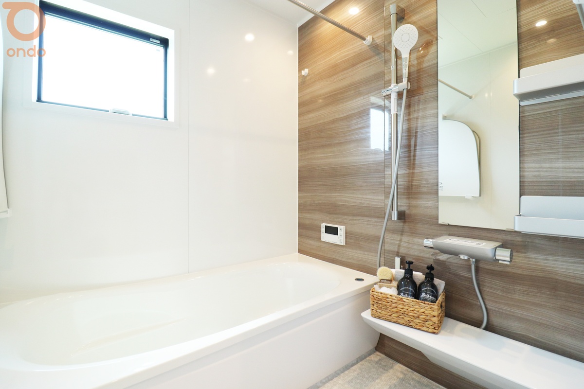 ■木目調の温かさを感じるデザイン。ゆったりご入浴いただけます。便利な浴室乾燥機付きで、天候問わず洗濯物をカラッと乾かせます。カビ対策にも◎