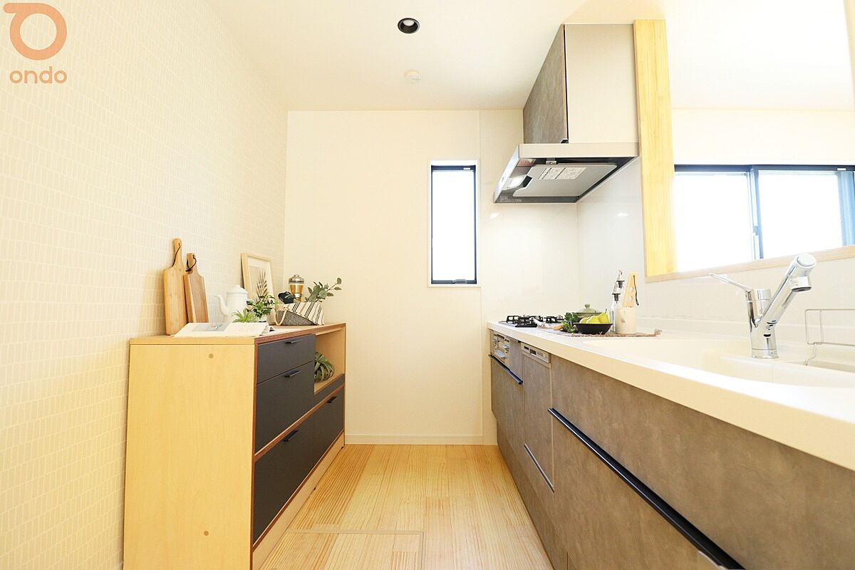 ■対面式のキッチンは、リビングの様子を見ながら調理ができて、家族との会話も自然と弾みます。毎日の料理時間が楽しくなるキッチンです。