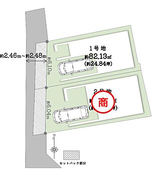 | 駐車場 | 0台 ~ 1台 | 道路の幅員 | 【西 約2.4m/公道・私道】【1号地/セットバック:約9.41m2 】 |