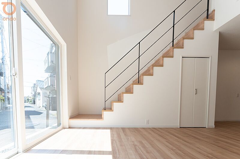 高さのある天井と大きな窓がもたらす解放感。吹き抜けを通して光と...