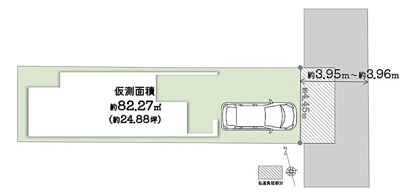 | 駐車場 | 0台 ~ 1台 | 道路の幅員 | 【東側 約3.95~3.96m(幅員)/私道】【私道負担:約8.96m2(約2.71坪)】 |