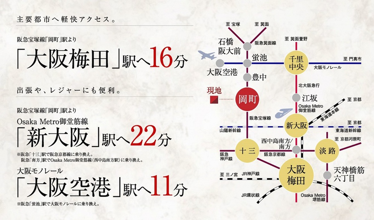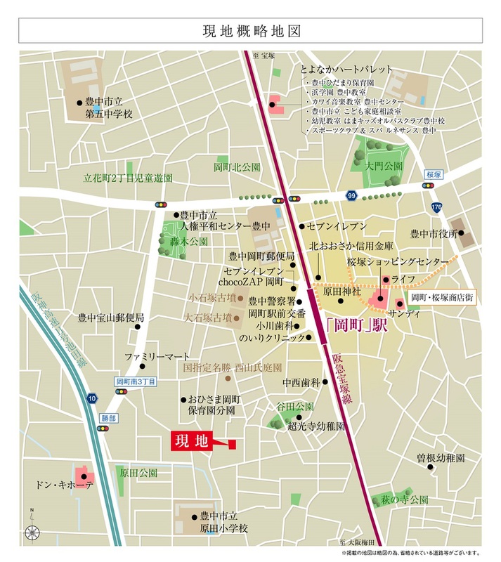 阪急宝塚本線「岡町」駅 徒歩7分 (約520m~560m) 阪急宝塚本線「曽根」駅 徒歩11分 (約840m~880m) 阪急宝塚本線「豊中」駅 徒歩18分 (約1380m~1420m) |