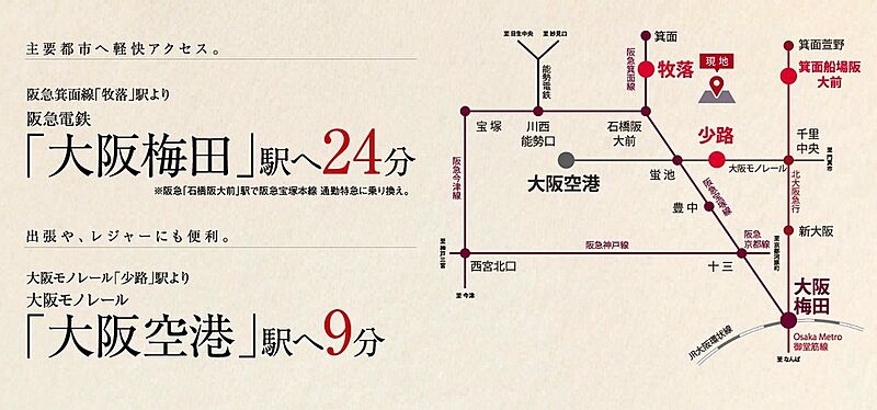阪急箕面線「牧落」駅 徒歩16分~17分 (約1280m~約1320m) 大阪モノレール本線「少路」駅 徒歩19分 (約1500m~約1520m) 北大阪急行電鉄「箕面船場阪大前」駅 バス7分、阪急バス「北緑丘」停 徒歩5分~6分 (約390m~約410m) |
