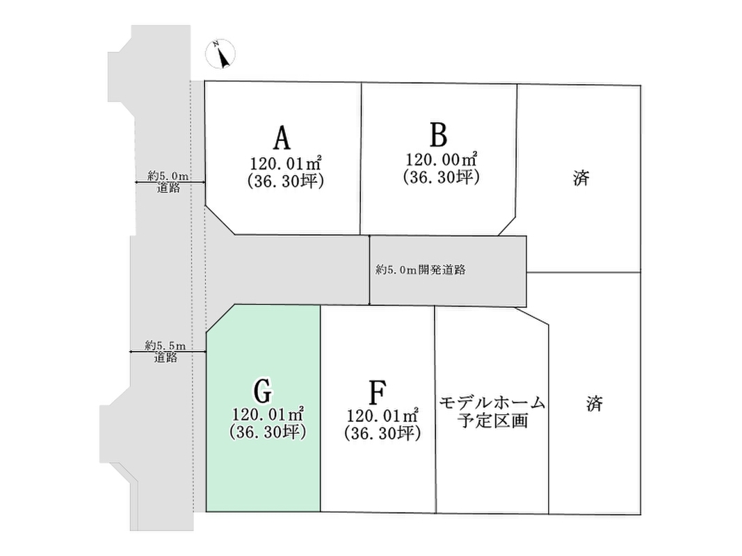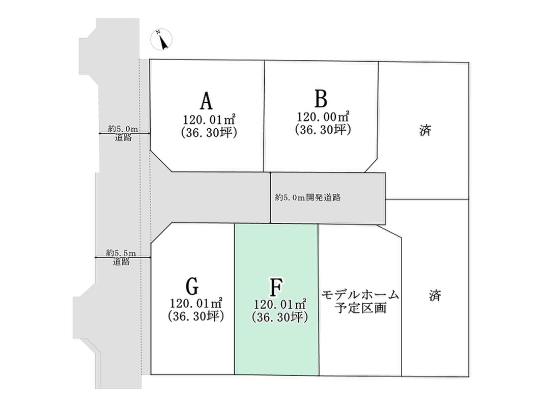 | 駐車場 | 1台 ~ 2台 | 道路の幅員 | 西側約5.5m、5m 敷地内開発道路約5m |