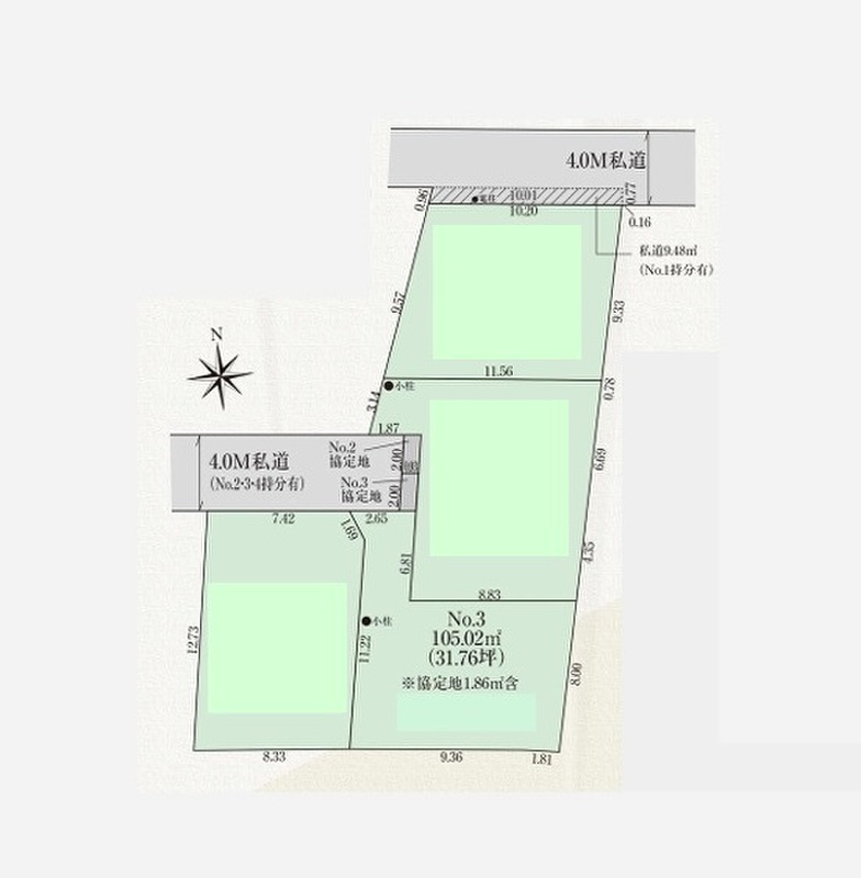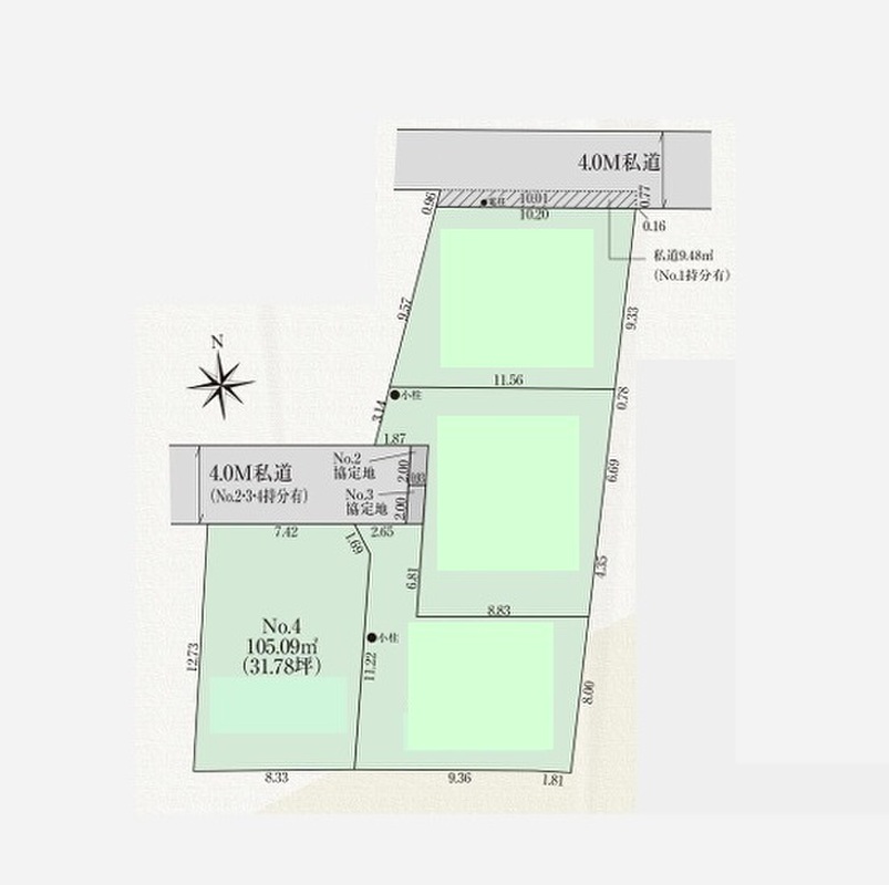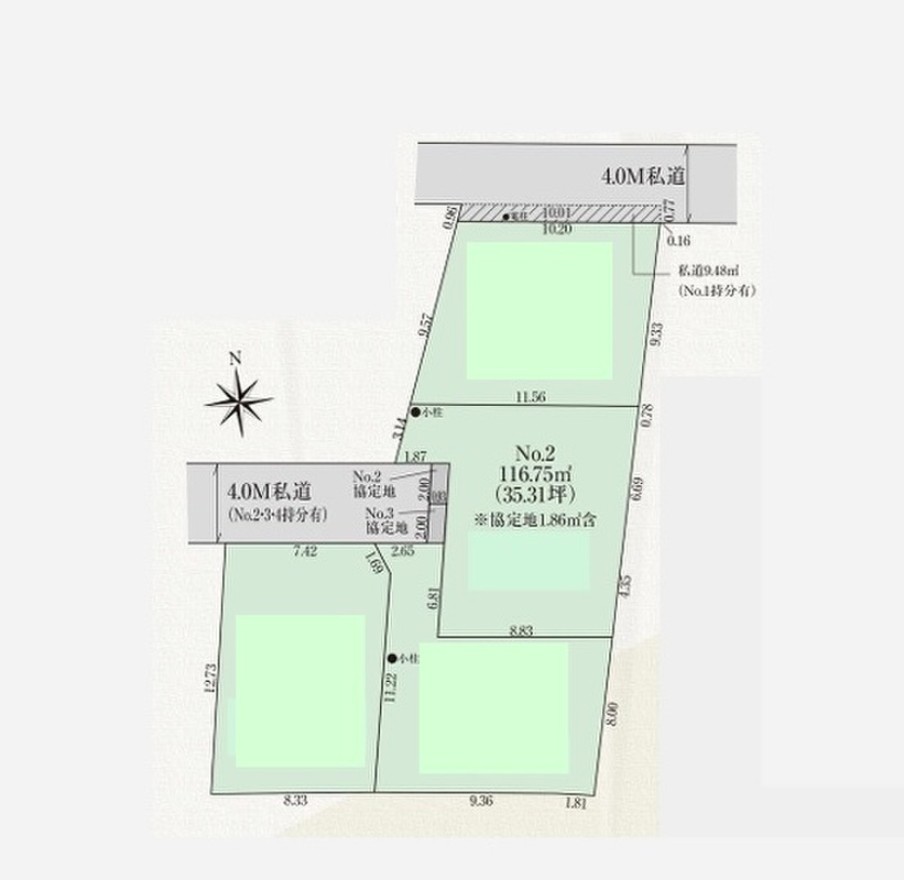 | 駐車場 | - | 道路の幅員 | 北側4m私道、西側4m私道(私道持分:62m2×各1/3)、2号地、3号地協定部分:各1.86m2 |