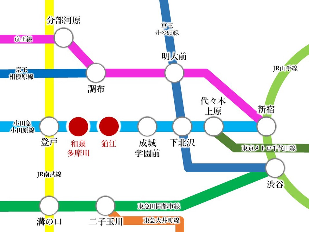 - 小田急小田原線「和泉多摩川」駅 徒歩7分小田急小田原線「狛江」駅 徒歩11分JR南武線「登戸」駅 徒歩19分