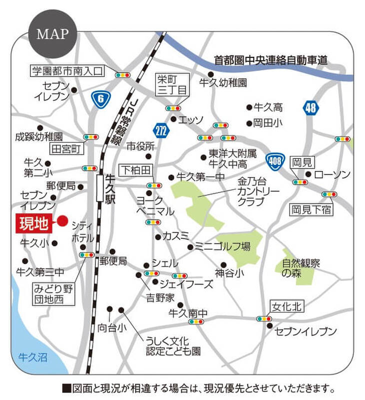 - ※地図、航空写真情報および地形ならびに周辺のお店・施設は、必ずしも現況を表すものではありません。