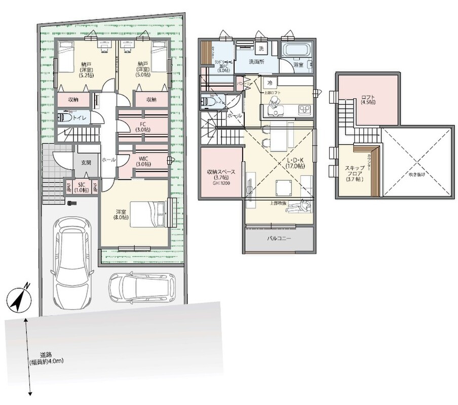 | 駐車場 | 1台 ~ 2台(自由設計につきカースペースの台数は調整可能です。) | 道路の幅員 | 南側4m公道 |