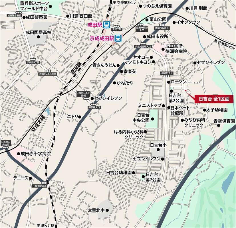 2路線利用可能 日吉台1丁目 南西角地で陽当り良好 京成成田駅徒歩14分 建築条件付き売地 6m道路の南西角地で陽当り良好スーパー、コンビニ、総合病院、保育園、小学校、公園すべて徒歩10分以内