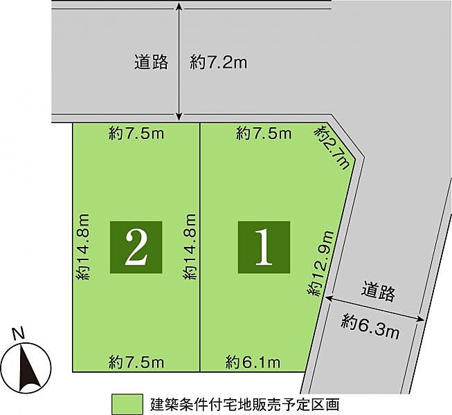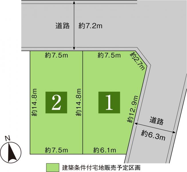 | 建築条件 | 建築条件付 建築条件付き土地とは一定期間内に、その土地に建築する建物の請負契約が締結されることを条件に販売される土地のことです。 土地売買契約締結後、建築請負会社と購入した土地に建築する建物について協議することになります。広告に参考プランが掲載されている場合でも、プランは一例であり、実際の建築プランは建築請負会社と土地購入者で協議・検討することが可能です。 期間内に建築プランが決まらず建築請負契約が成立しなければ土地売買契約は白紙となり、支払済みの金銭はすべて返還されます。 建築請負会社が指定されている場合と指定されていない場合があります。 また、建築条件付き土地の価格には、建物価格は含まれません。 |