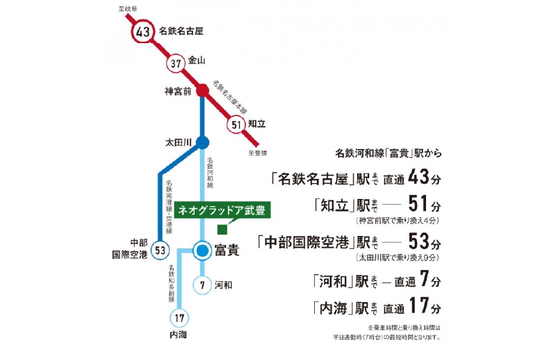 名鉄河和線「富貴」駅 徒歩14分~17分 名鉄河和線「知多武豊」駅 徒歩25分~27分 JR武豊線「武豊」駅 徒歩28分~30分 |
