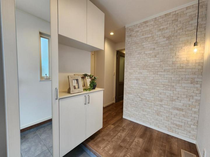 アイキャッチとなる玄関正面にはエコカラットや照明でおしゃれな空間に。玄関収納にカウンタータイプ採用すれば、季節の小物やお子様の作品等を置きオリジナルのインテリアを楽しんで頂けます。