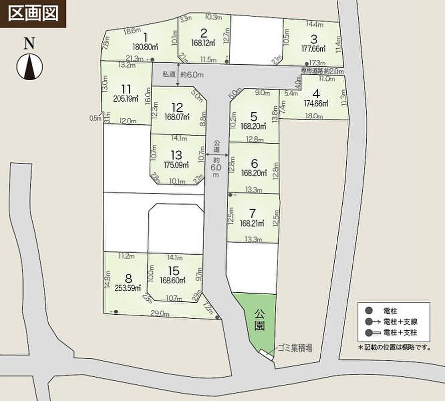 | 建物面積 | - | 土地面積 | 168.07m2~253.59m2<私道負担あり:262.42m2×持分1/8> |