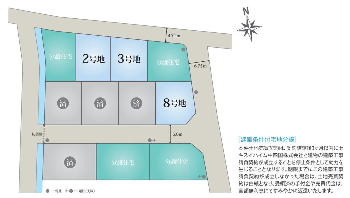 その他の制限にて、街並みを保つための街並みガイドライン有り。 町内会費が別途必要です。 既存のゴミステーションをお使いください。 【建築条件分宅地販売】 本分譲地の土地売買契約は、契約締結後3ヵ月以内に売主であるセキスイハイム中四国株式会社との間で建築工事請負契約が成立することを条件として効力を生じます。期限までに、建築工事請負契約が成立しなかったときは、土地売買契約の無効が確定し、受領書の手付金等は、全額無利息にてすみやかに返還いたします。 ※「HOMES見ました!」などと、お気軽にお問い合わせください。 |