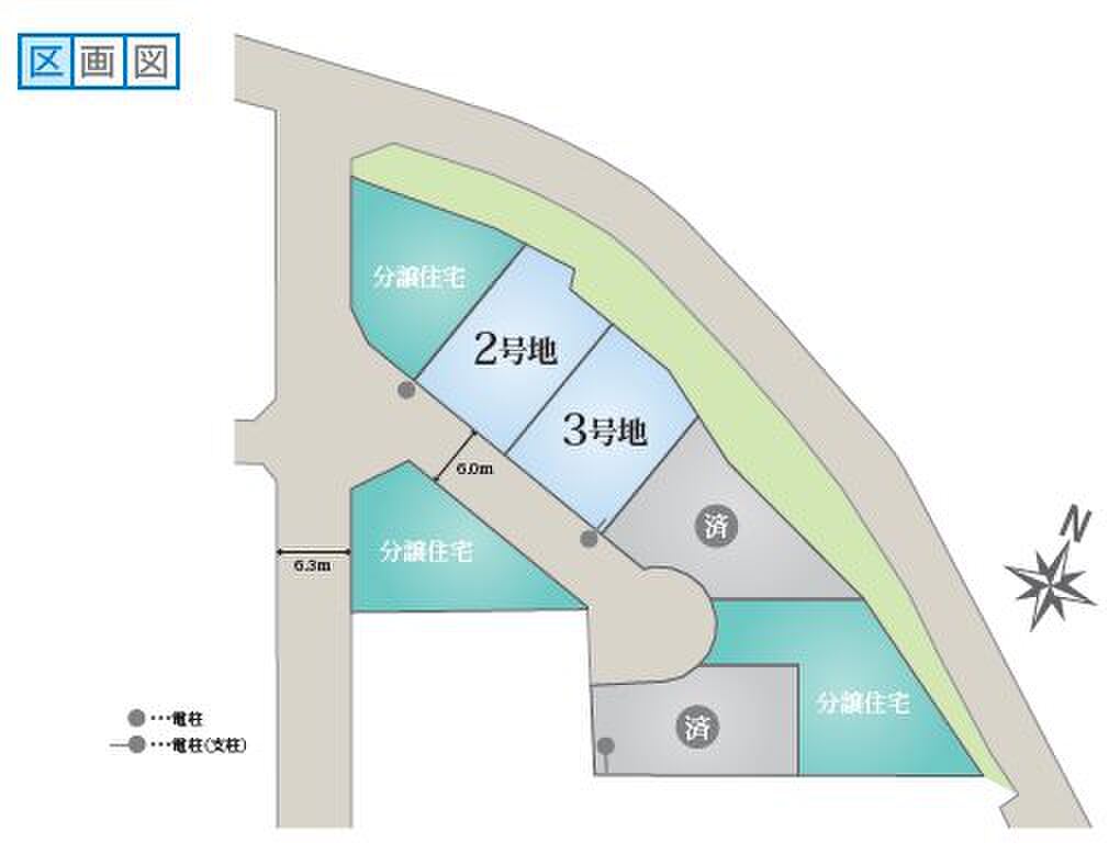 | 駐車場 | 1台 ~ 4台 | 道路の幅員 | 分譲地内6.0m(私道負担38.6m2)、南西側6.3m(公道) |