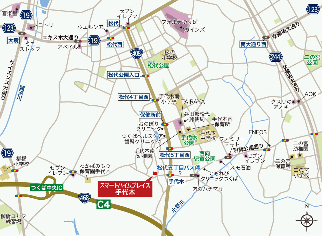 つくばエクスプレス「つくば」駅 バス18分「松代五丁目」バス停 徒歩4分 |