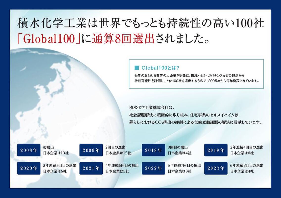 積水化学工業は世界でもっとも持続性の高い100社「Global100」に通算8回選出されました。