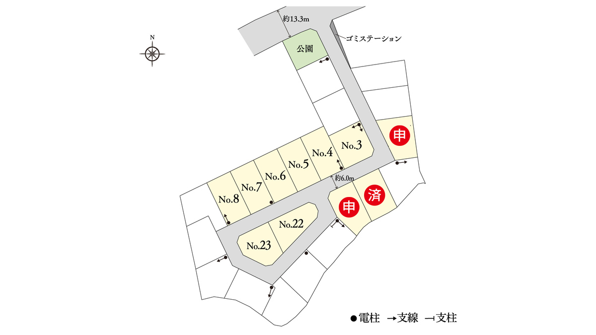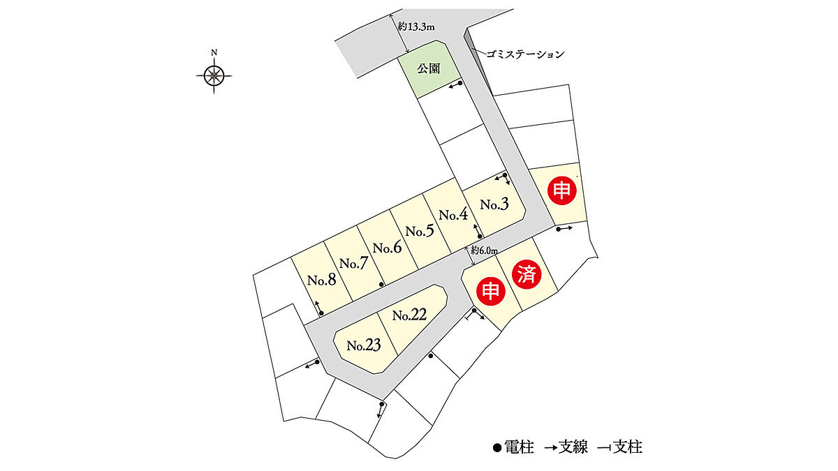 | 駐車場 | - | 道路の幅員 | 北西側13.3m公道、6.0m開発道路(アスファルト舗装) |