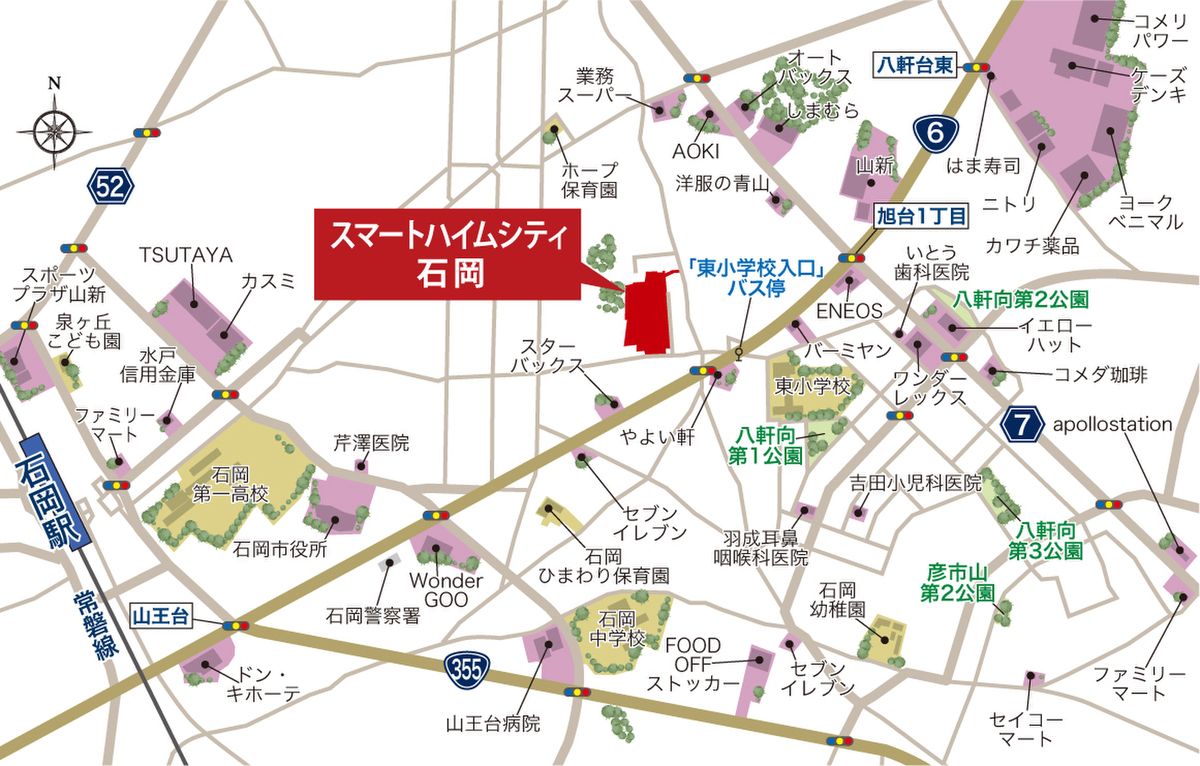 JR常磐線「石岡」駅 バス10分~20分「東小学校入り口」バス停 徒歩3分~4分 |