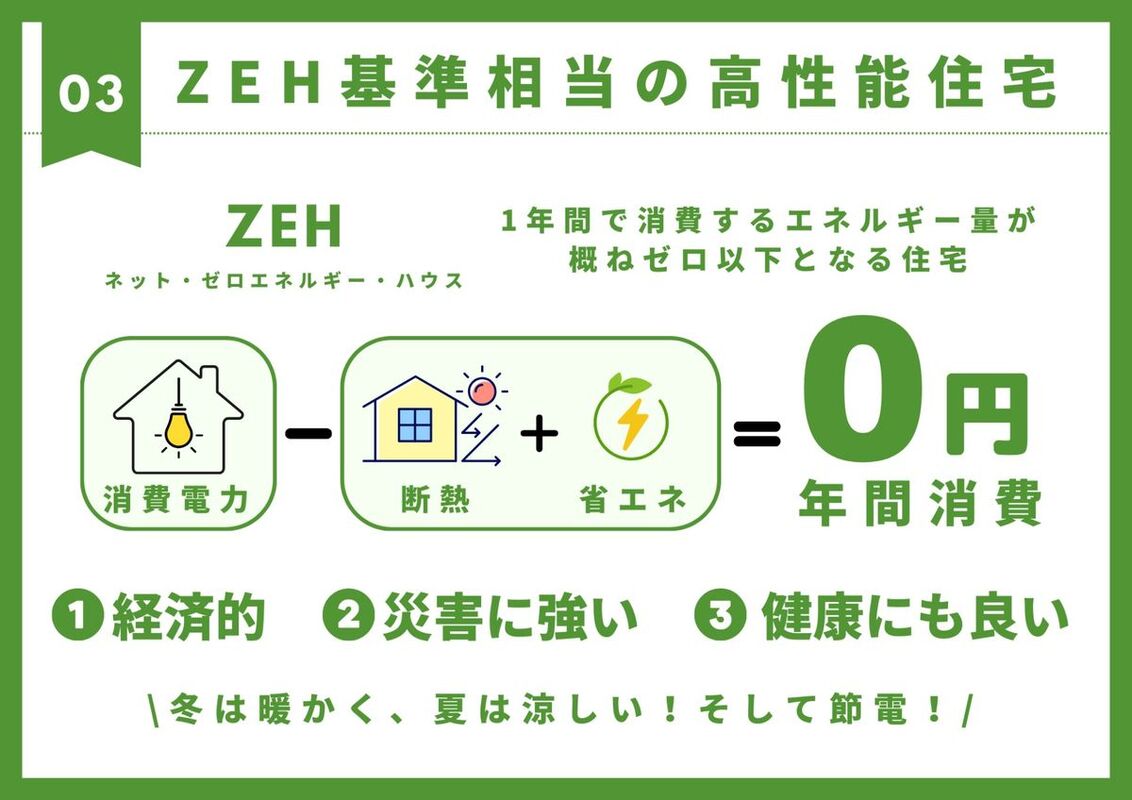 【ZEH基準】冬は暖かく、夏は涼しい快適さを実現!省エネと再生可能エネルギーの活用により、年間のエネルギー消費を実質ゼロにする住宅で、節電効果も期待できます。ぜひその違いをご体感ください。