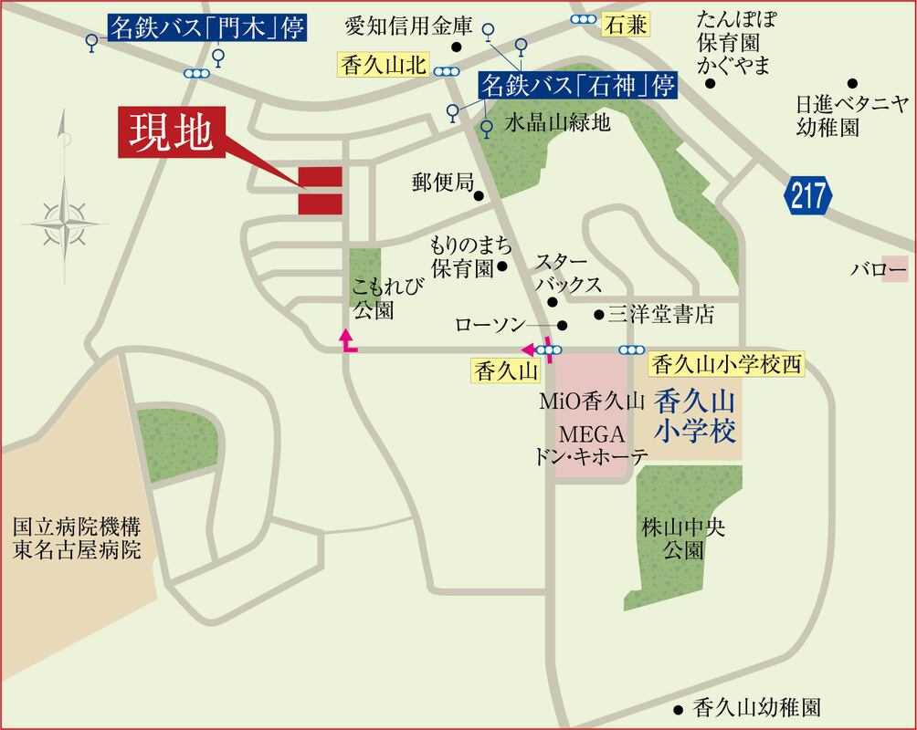 名古屋市営東山線「星ヶ丘」駅 名鉄バス 乗車時間15~22分 「石神」停 徒歩4分~5分 名古屋市営東山線「星ヶ丘」駅 名鉄バス 乗車時間19~22分 「門木」停 徒歩6分~7分 |