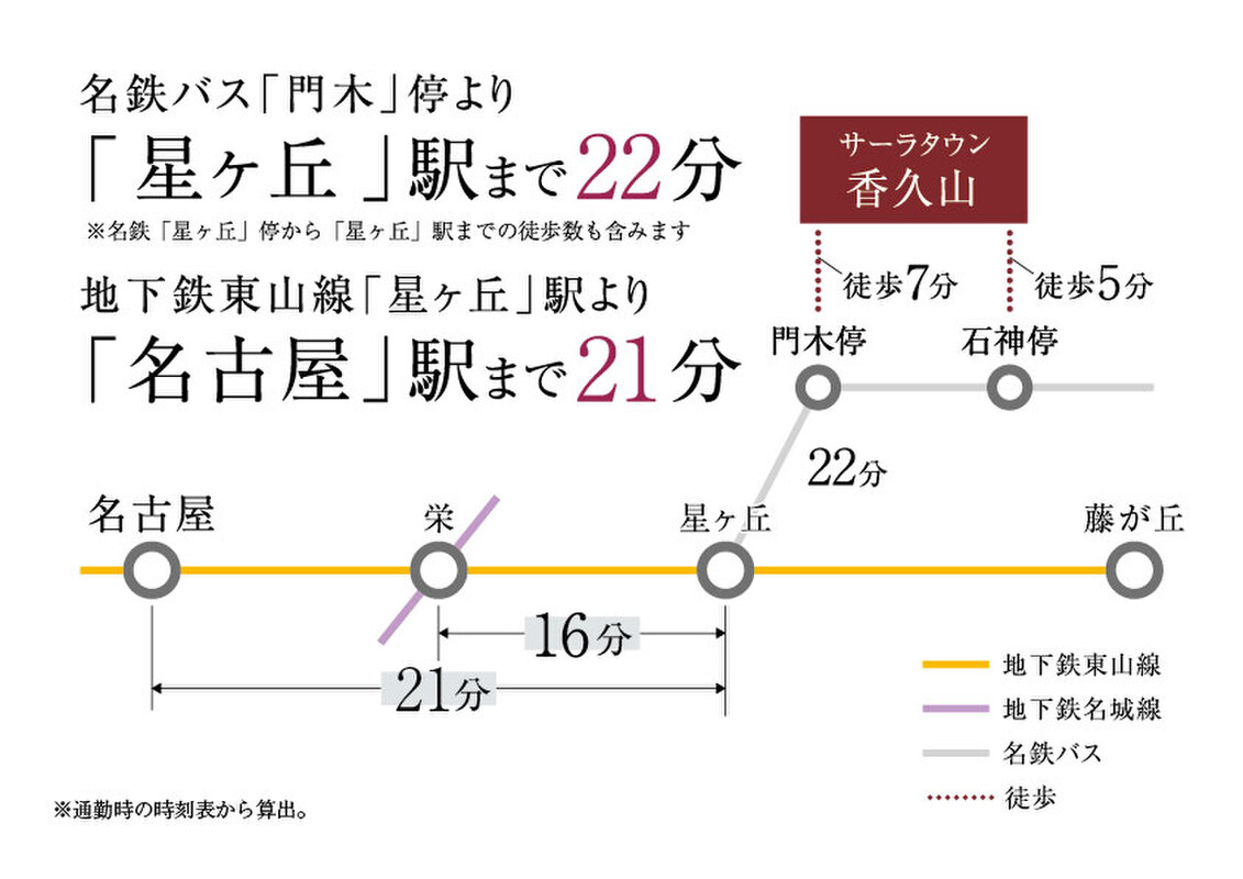 - 名古屋市営東山線「星ヶ丘」駅 名鉄バス 乗車時間15~22分 「石神」停 徒歩4分~5分名古屋市営東山線「星ヶ丘」駅 名鉄バス 乗車時間19~22分 「門木」停 徒歩6分~7分