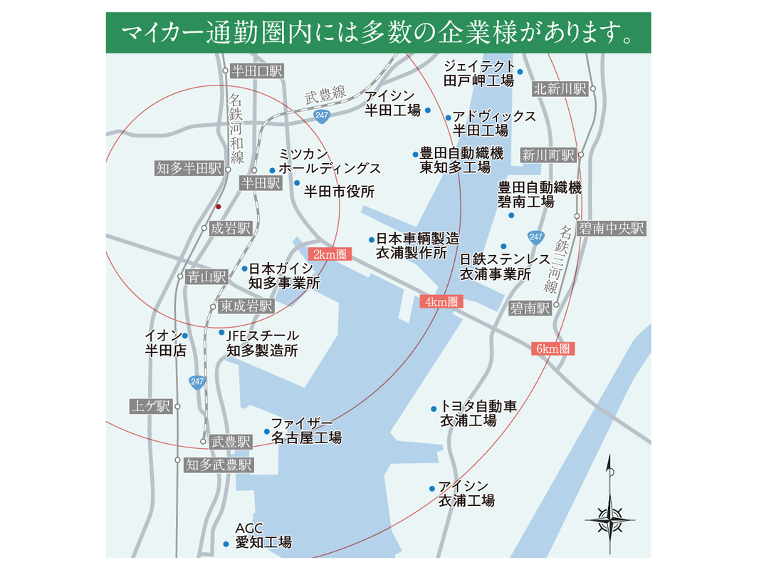 名鉄河和線「成岩」駅 徒歩6分~7分 名鉄河和線「知多半田」駅 徒歩10分~11分 JR武豊線「半田」駅 徒歩16分~17分 |