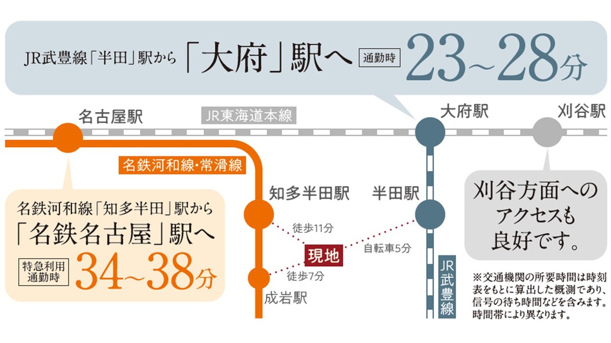\名鉄線、JR線計3駅が利用可能/・名鉄「知多半田駅(特急停車)」まで徒歩11分 ・名鉄「成岩駅(急行停車)」徒歩7分・JR武豊線「半田駅」まで自転車5分