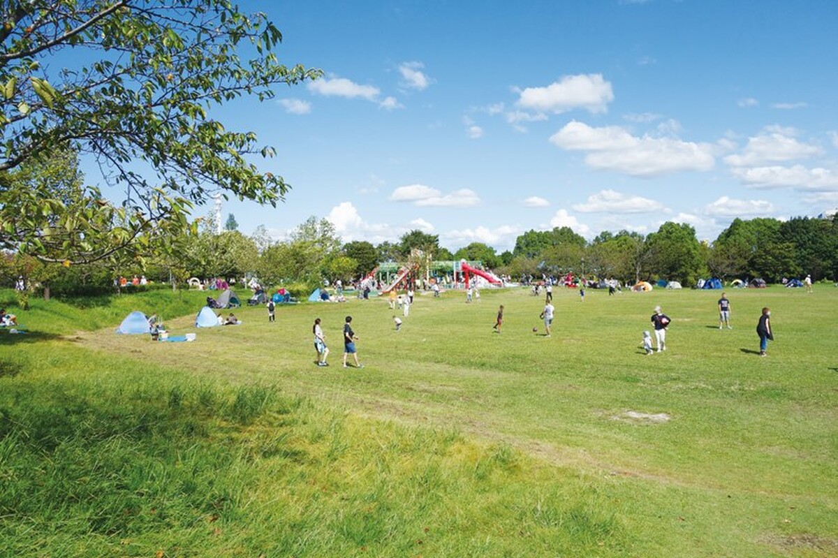 芝生広場、アスレチック、宿泊施設を備えた、大型公園。