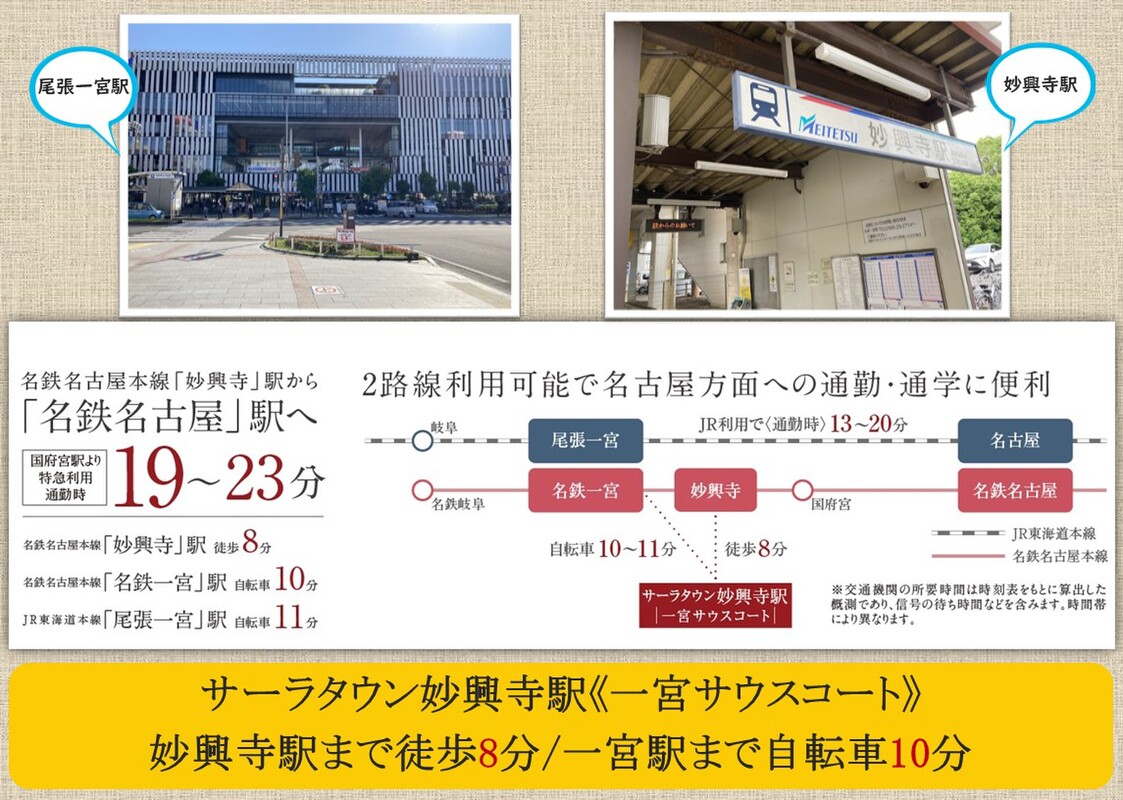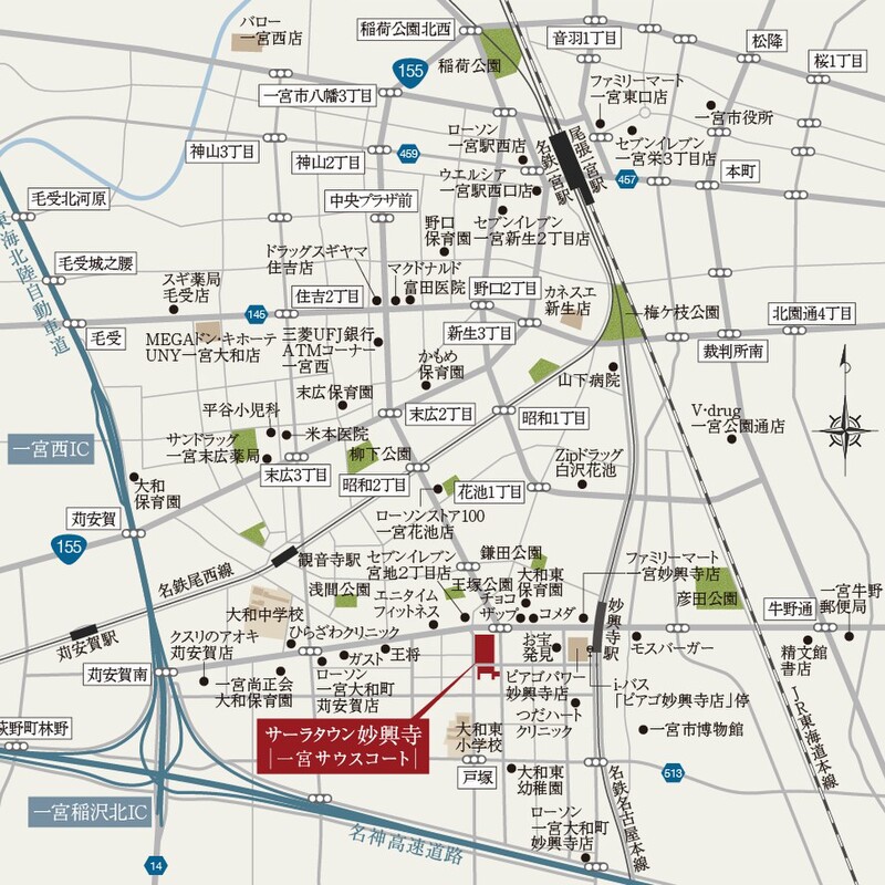 名鉄名古屋本線「妙興寺」駅 徒歩7分~8分 名鉄名古屋本線「名鉄一宮」駅 車で7分/自転車で10分 i-バス「ピアゴ妙興寺店」停 徒歩6分~7分 |