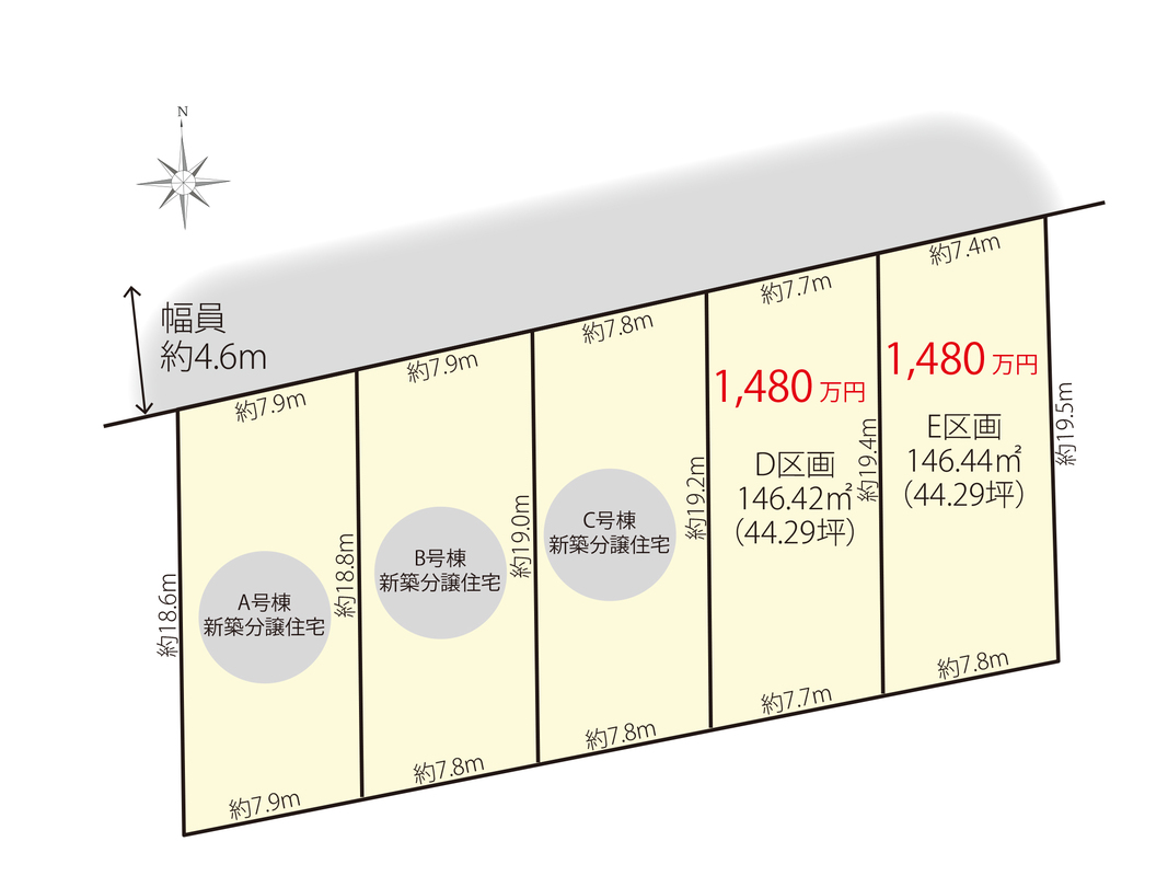 | 建物面積 | - | 土地面積 | 146.42m2(D区画)~146.44m2(E区画) |