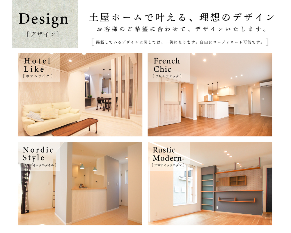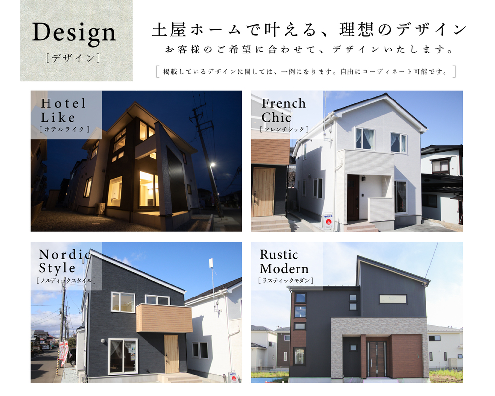 当社では「フレンチシック」・「ノルディック」・「ホテルライク」と様々なスタイルプランがあり、お客様の理想とする住宅に仕上がるでしょう。