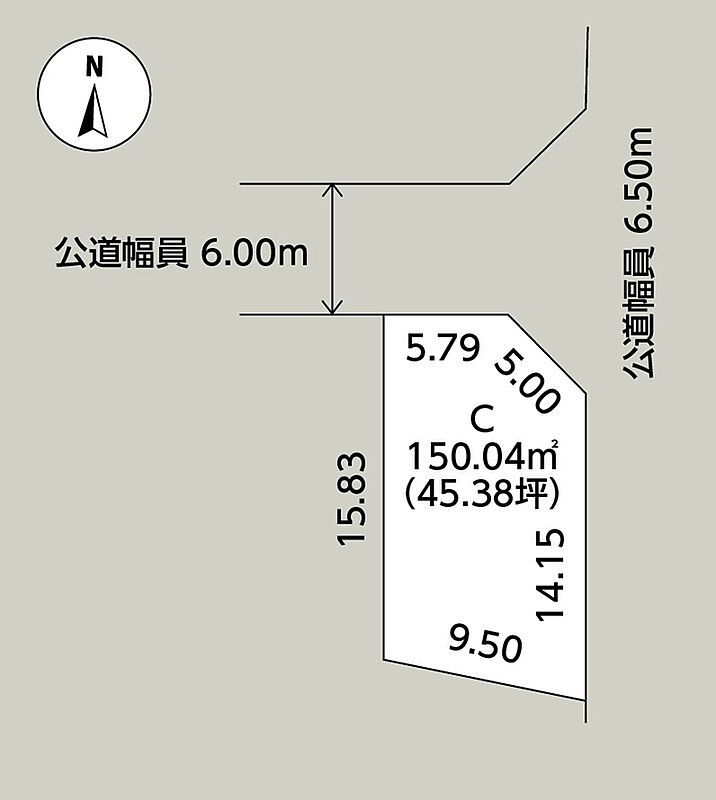 | 駐車場 | 2台 | 道路の幅員 | 東側幅員6.50mの公道に14.15m、北側幅員6.00mの公道に5.79m接する |