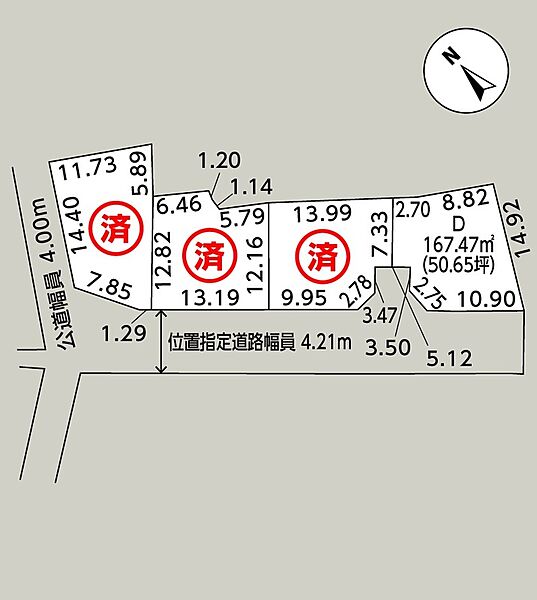 | 駐車場 | 2台 | 道路の幅員 | 南西側幅員4.21mの指定道路に10.90m接する |