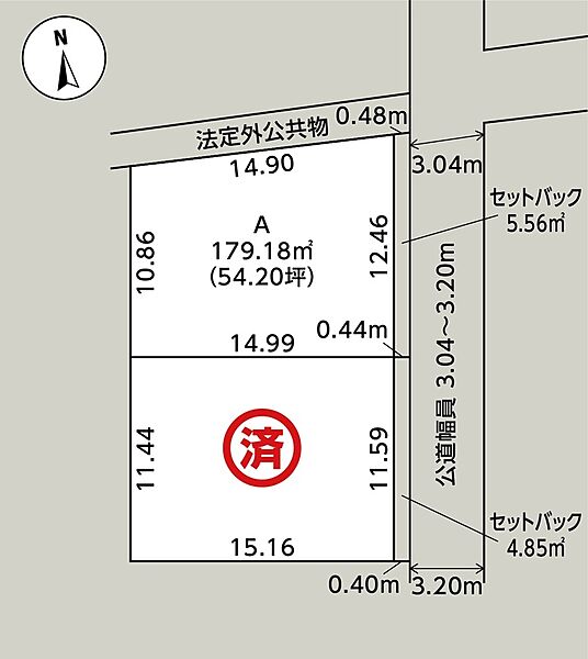 | 駐車場 | 2台 | 道路の幅員 | 東側幅員3.04~3.20m(不定幅員)の公道に12.46m接する |