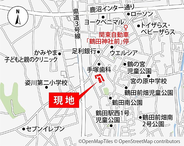 - 関東自動車「鶴田神社前」停 約800m~約850m(徒歩10~11分)
