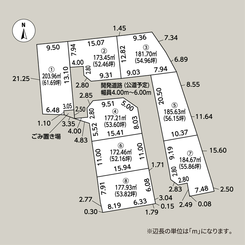 | 駐車場 | - | 道路の幅員 | 全区画幅員4.00m~6.00m(不定幅員)の開発道路(公道予定)に接する |