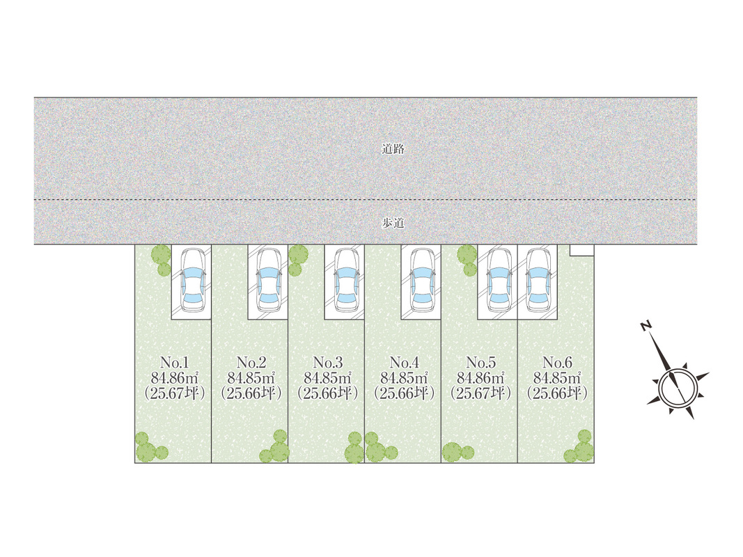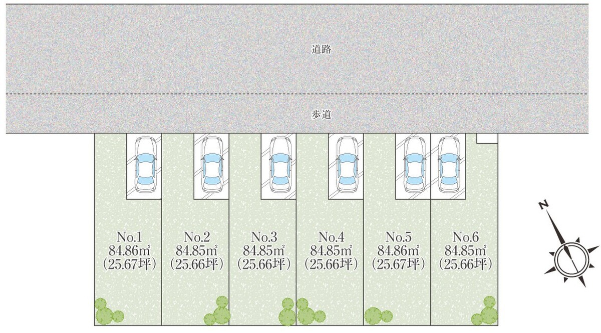 | 建物面積 | - | 土地面積 | 84.85m2~84.86m2(6区画) |