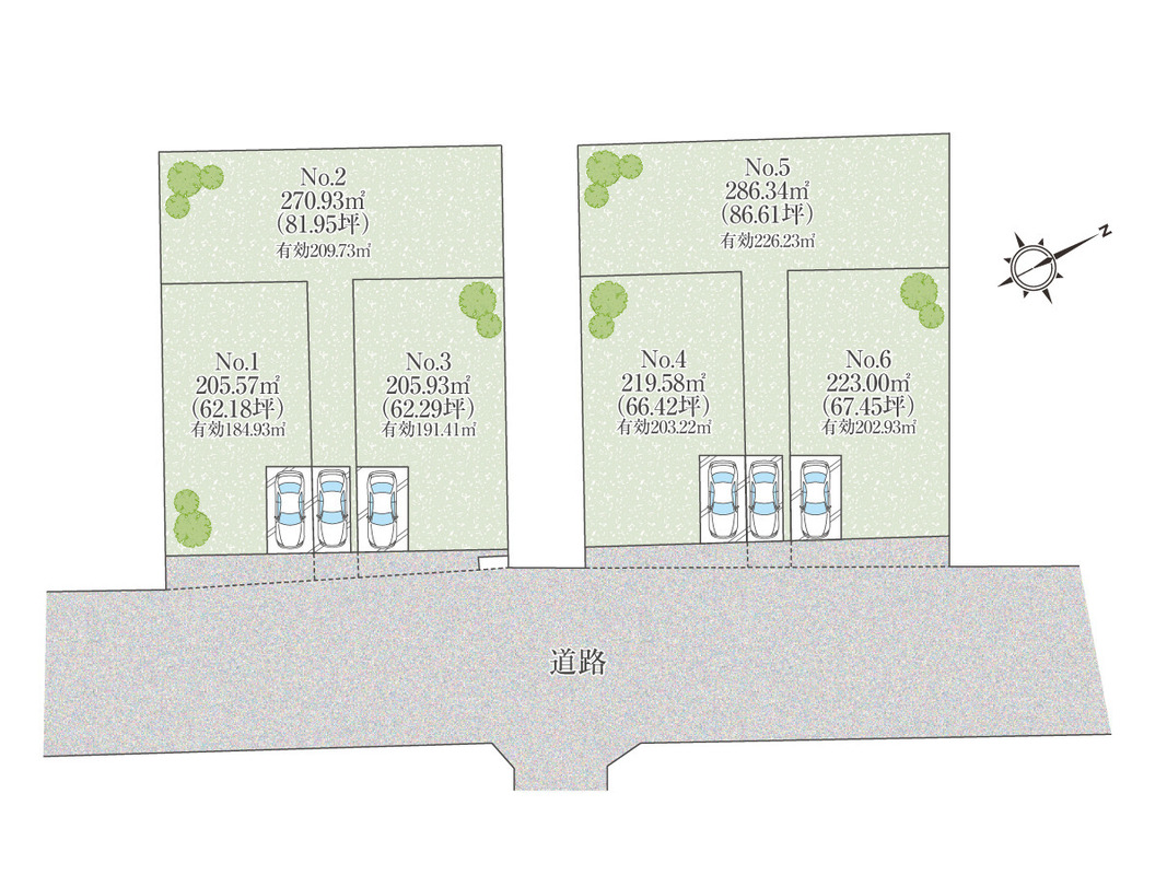 | 建物面積 | - | 土地面積 | 205.57m2~286.34m2(6区画) |
