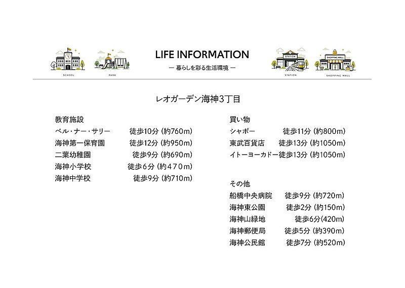 - JR総武線「船橋」駅 徒歩12分東葉高速鉄道「東海神」駅 徒歩8分京成本線「海神」駅 徒歩5分
