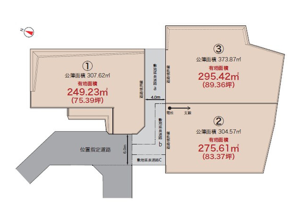 | 駐車場 | - | 道路の幅員 | 4m(私道負担あり 2号地:28.91m2 3号地:64.49m2) |