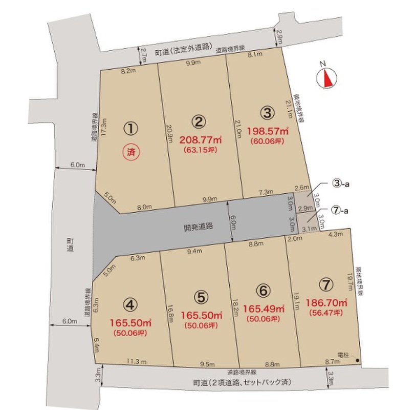 | 駐車場 | - | 道路の幅員 | 西側町道6m 新設開発道路6m 南側町道3.3m(セットバック済み) |