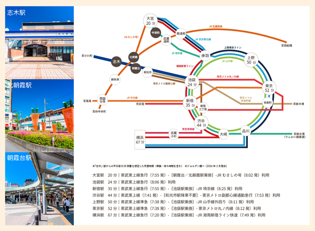 JR武蔵野線「北朝霞」駅 バス19分「氷川前」バス停 徒歩4分 東武東上線「朝霞台」駅 バス19分「氷川前」バス停 徒歩4分 東武東上線「志木」駅 バス19分「氷川前」バス停 徒歩4分 |
