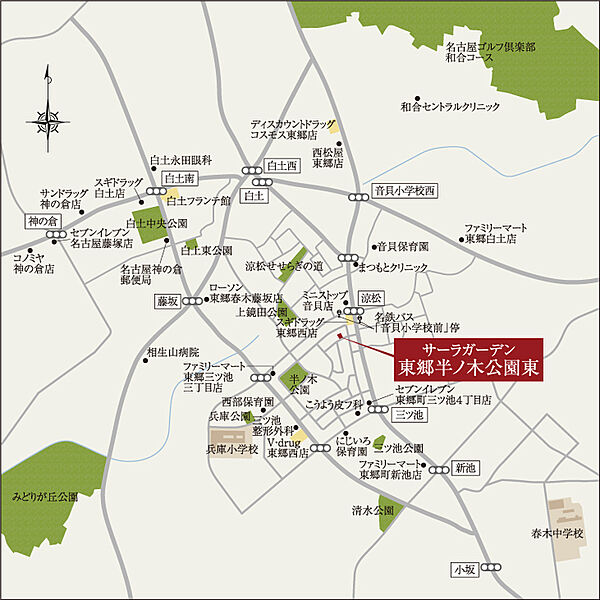 名鉄バス「音貝小学校前」停まで徒歩2分、スギドラッグ東郷西店まで徒歩2分。音貝保育園まで徒歩6分。兵庫小学校まで徒歩8分。教育施設や買い物施設が近く、落ち着いて暮らせる環境です。