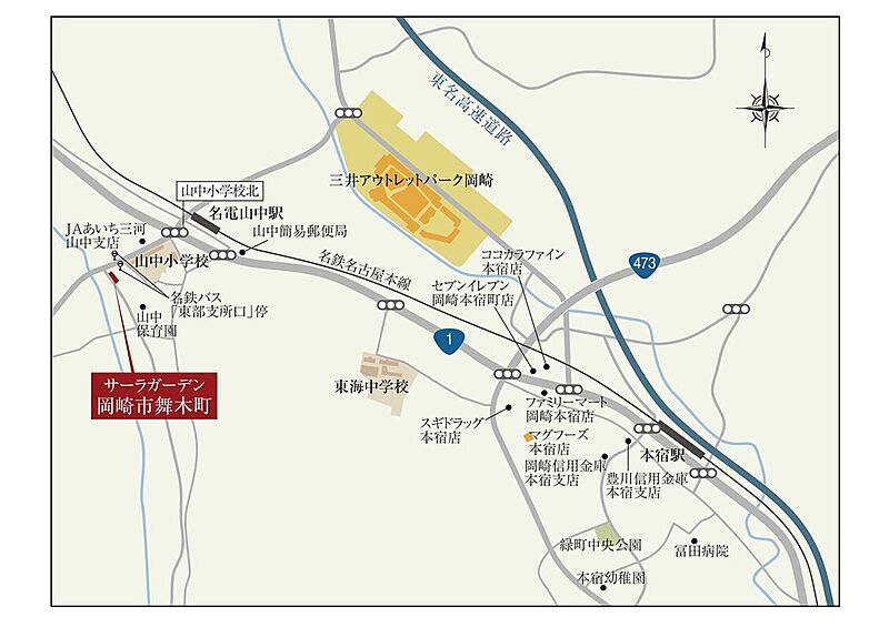 名鉄「名電山中」駅まで454m(徒歩約6分)、名鉄「本宿」駅まで2,145m(自転車約15分) 線路の音もさほど気にならず、静穏と利便性が際立つ程よい距離。