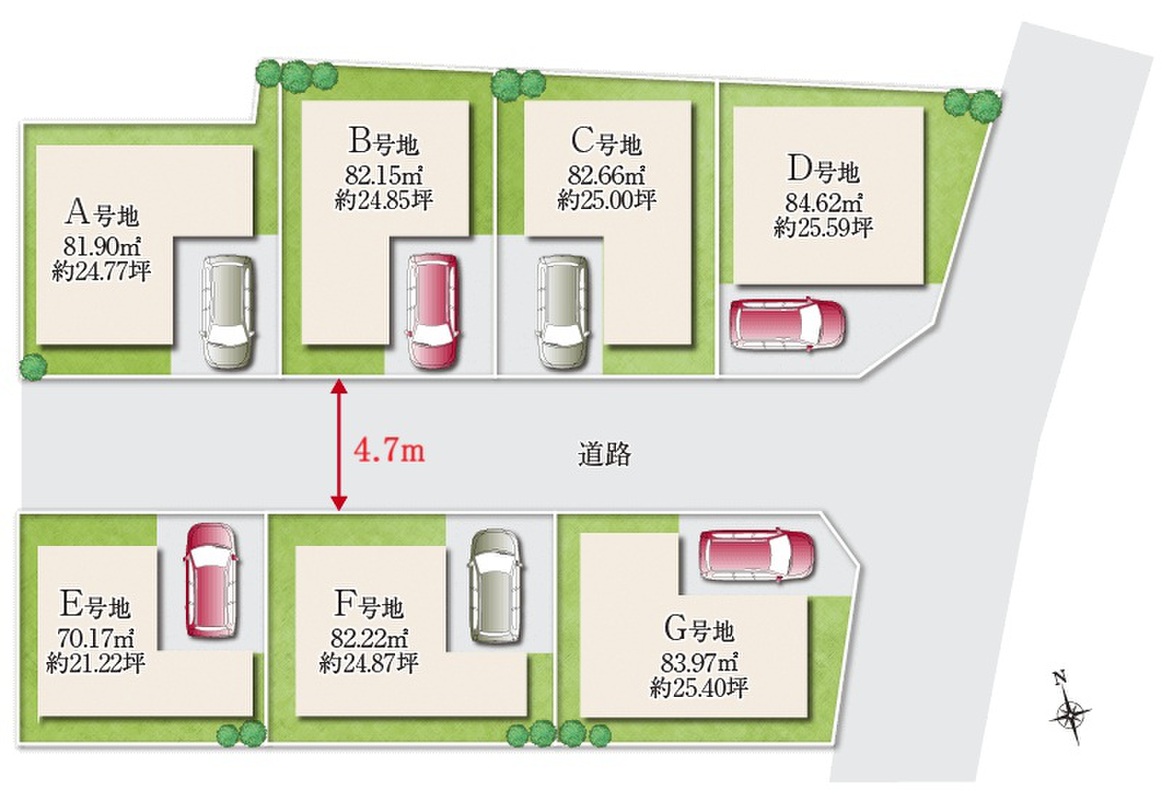 | 建物面積 | - | 土地面積 | 70.17m2(約21.22坪)~84.62m2(約25.59坪) |