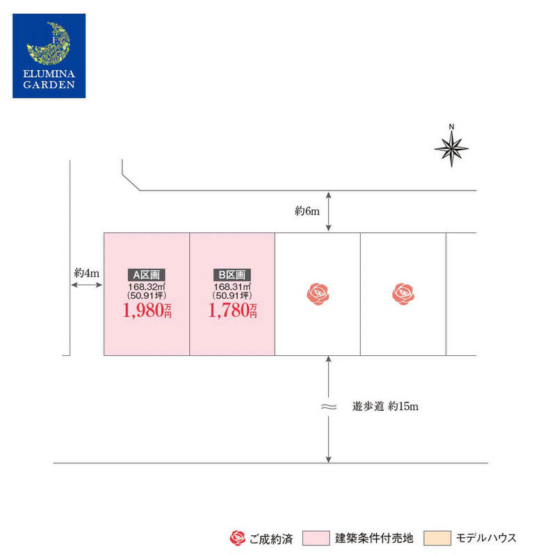| 主たる設備の概要 | 北側:約6m、南側:約15m(遊歩道)、西側:約4m | 開発許可番号 | 開発許可申請不要な土地のためなし |