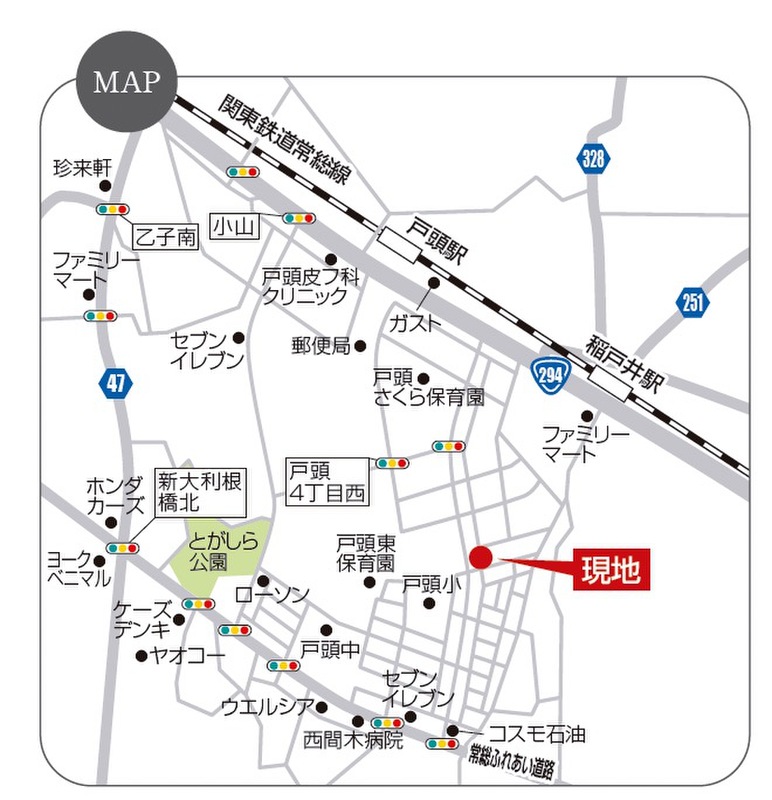 関東鉄道常総線「稲戸井」駅 徒歩10分 関東鉄道常総線「戸頭」駅 徒歩14分 関東鉄道常総線「ゆめみ野」駅 徒歩28分 |